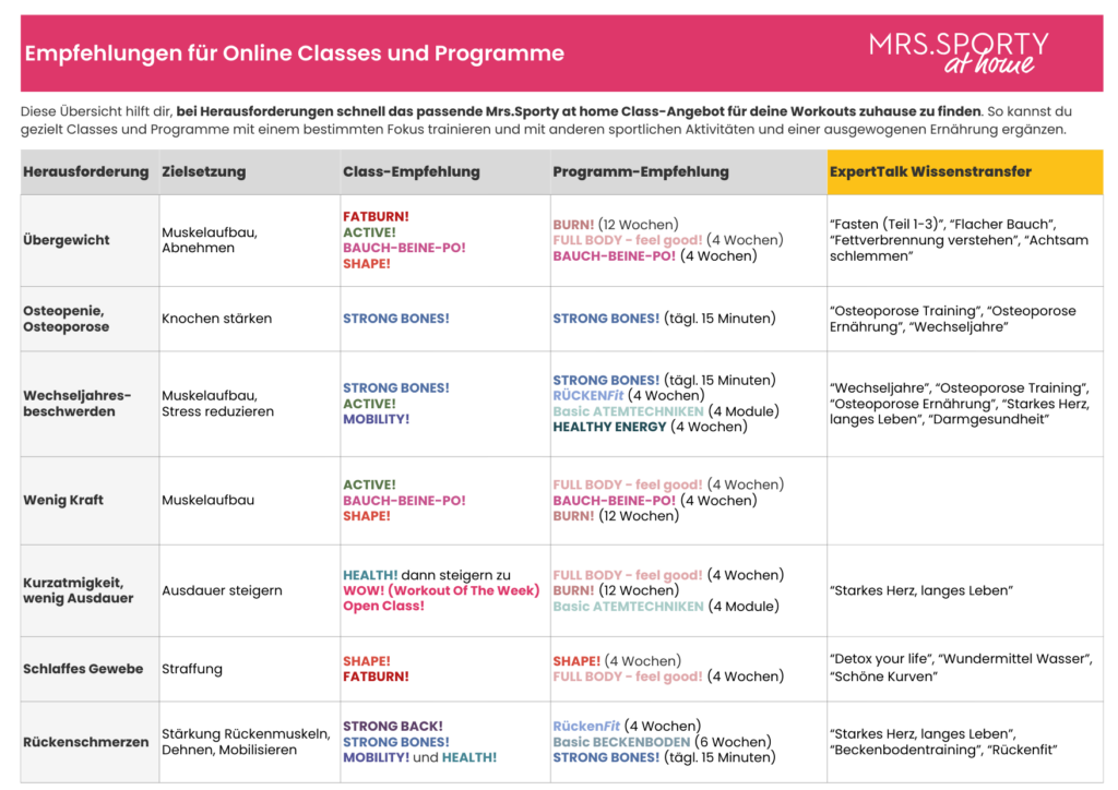 Wir wissen, dass dir Fokus, Effizienz und Regelmäßigkeit im Training zahlreiche Vorteile und positive Effekte bringen. Ob Gewichtszunahme, Osteoporose, Verspannungen, Kraftlosigkeit, Schweißausbrüche, Schlafprobleme oder Stress – mit dem richtigen Training und einem guten Verständnis über deinen Körper kannst du vielen Beschwerden aktiv entgegenwirken. Unser Class-Guide hilft dir dabei, deinen Trainingsplan mit den Classes und Programmen zu erstellen, die wichtig für dich sind. Fokussiere dich auf bestimmte Workouts, um deine Herausforderungen besser zu meistern.